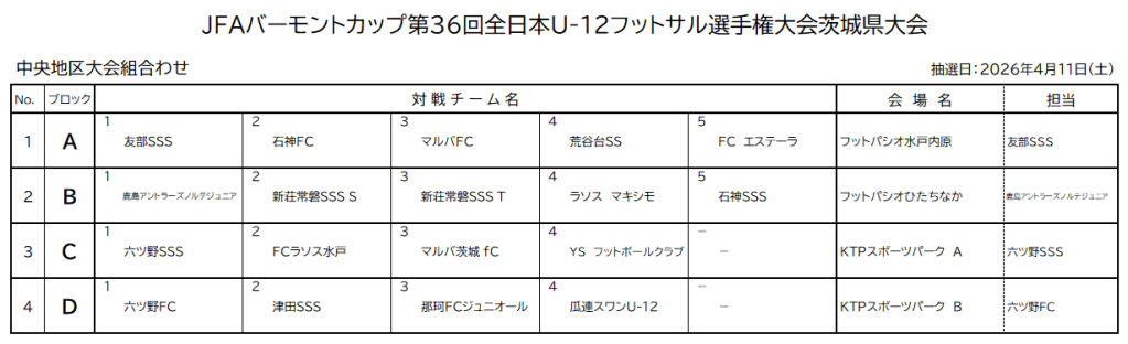 | 4 | D | 1 | 六ツ野FC | 2 | 津田SSS | 3 | 那珂FCジュニオール | 4 | 瓜連スワンU-12 | - | - | KTPスポーツパーク B | 六ツ野FC |